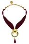 Featuring a maroon velvet choker necklace with an 18k gold plated pendant made of swarovski crystals and semi-precious stones, set in brass and copper metal.