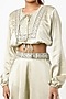 Featuring a pastel green top in satin base with hand embroidery and adjustable waistline. It is paired with matching flared palazzo pants.