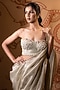 Featuring a pastel green saree in tissue base. It is paired with a corset-style blouse having pearl and diamond hand embellishment. Accentuate it with statement earrings and heels, perfect for cocktail parties or wedding receptions.
