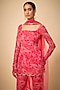 Featuring a pink top in chinon base with paisley print and sequins embroidery. It is paired with boot-cut pants and a net dupatta. Style it with statement earrings and block heels for a festive occasions, sangeet ceremony or family gatherings.