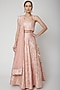 Featuring an apricot lehenga in dupion silk base with applique embroidery. It is paired with a matching blouse and dupatta.