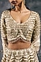 Featuring an ivory lehenga in shimmer organza base with pipe and gota work. It is paired with a blouse and a dupatta. Accentuate it with statement earrings, a clutch and block heels for weddings or sangeet ceremonies.