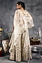 Featuring an ivory cape in organza base. It is paired with shimmer raw silk sharara pants having mirror work, including a blouse. Accentuate it with statement earrings, a clutch and block heels for weddings or sangeet ceremonies.
