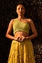 Featuring a yellow lehenga in shimmer organza base with bead work. It is paired with a blouse and a dupatta. Accentuate it with statement earrings, a sleek braid, and metallic heels for a dramatic ensemble, ideal for haldi ceremonies or weddings.