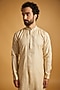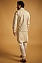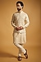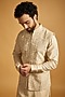 Featuring a beige bundi jacket in tussar silk base with floral embroidery. it is paired with a kurta and pyjama pants. Perfect for a wedding or engagement ceremony.