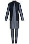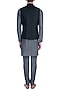 Featuring a black tanchoi bundi jacket in silk base. It is paired with contrasting grey kurta and churidar pants.