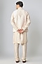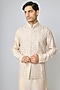 Featuring a blush bundi jacket in silk base. It is paired with a kurta and pants. Style it with mojaris for a wedding, sangeet or engagement ceremony.