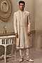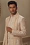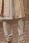 Featuring a pink sherwani in raw silk base with aari hand embroidery. It is paired with contrasting churidar pants, a kurta, a kamarbandh , and a palla.