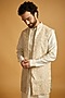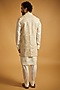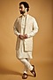 Featuring a cream indowestern jacket in tussar silk base with dusky floral embroidery. it is paired with a kurta and pyjama pants. Perfect for a wedding or engagement ceremony.
