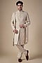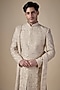 Featuring a gold sherwani in silk base. It is paired with a kurta, pants, a dupatta, a belt, a safa fabric and jooti fabric. Accentuate it with handcrafted juttis and layered pearls for a refined, royal finish, ideal for wedding or engagement ceremonies.