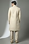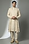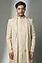 Featuring a gold sherwani in silk base. It is paired with a kurta, pants and stole. Accentuate it with juttis and layered pearls for a refined, royal finish, ideal for wedding or engagement ceremonies.