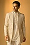 Featuring an ivory indo-western jacket in silk base. It is paired with a kurta and pants. Accentuate it with brown loafers for an elegant yet easy going look, perfect for a wedding or engagement ceremony.