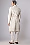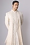 Featuring an ivory sherwani in silk base. It is paired with a kurta, pants, a dupatta, a belt, a safa fabric and jooti fabric. Accentuate it with handcrafted juttis and layered pearls for a refined, royal finish, ideal for wedding or engagement ceremonies.