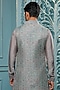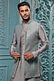 Featuring a mint and grey indo-western jacket in pashmina base. It is paired with a contrasting kurta and pants.