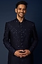 Featuring a navy blue sherwani in silk base with ornate hand embroidery and digital embroidery. It is paired with churidar pants. Perfect wear for a wedding or engagement ceremony. Perfect wear for sangeet ceremonies.