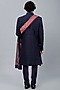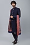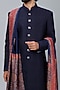 Featuring a navy blue sherwani in raw silk base with quilting. It is paired with matching churidar pants and a semi-pashmina woven dupatta. Accentuate with pair of mojaris for festive occasions or wedding ceremonies.