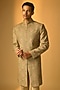 Featuring an olive green sherwani in silk base. It is paired with pants. Accentuate it with mojris and a beaded mala, perfect for a wedding or engagement ceremony.