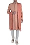 This stunning sherwani jacket is the perfect way to make a fashion statement at your next event. Crafted from crepe and silk in peach hue, this elegant ethnic jacket features intricate embroidery and a classic sherwani cut. Its paired with matching cream churidar pants and a dupatta to complete the ensemble.