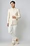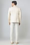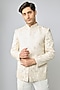 Featuring a pearl-colored bandhgala in silk base. It is paired with pants. Style it with mojaris for a wedding, sangeet or engagement ceremony.