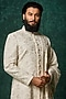 Featuring a pearl-colored sherwani in silk base with kashmiri jaal embroidery. It is paired with aligarhi pants. Style it with mojaris and malas for a wedding or engagement ceremony, exuding charm and elegance.