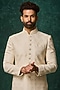 Featuring a pearl-colored sherwani in silk base with hand embroidery. It is paired with pants and a dupatta. Style it with mojaris and malas for a wedding or engagement ceremony, exuding charm and elegance.