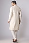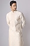 Featuring a pearl white kurta in silk base. It is paired with pants. Style it with kolhapuri sandals and a sleek watch for a complete look, perfect for a festive gathering and intimate pooja ceremony.
