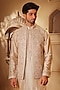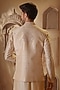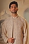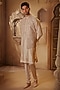 Featuring a beige bundi jacket in raw silk base with metallic thread, resham, cutdana and pearl embroidery. It is paired with a kurta and pyjama pants. Perfect attire for weddings, exuding traditional charm and elegance.