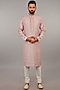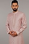 Featuring a pink kurta in pure silk base with woven butti detailing. It is paired with contrasting churidar pants in cotton silk base.