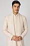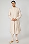 Featuring a pink sherwani in raw silk base with baroque jaal detail, including resham and moti embroidery. It is paired with a kurta, a dupatta and churidar pants. Perfect wear for weddings or engagement ceremonies.
