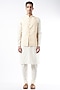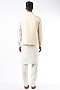 Featuring a peach bundi jacket in silk base with digital and hand embroidery. It is paired with a contrasting kurta and churidar pants.