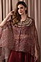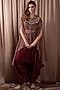 Featuring a maroon cape in organza and silk base with hand embroidery and print. It is paired with harem pants and a crop top. Accentuate it with statement earrings and heels for a sangeet ceremony.