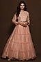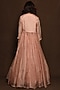 Featuring a pink layered skirt in moonga silk, organza, and net base with frill. It is paired with a matching crop top having hand embroidery.