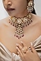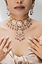 Featuring a 18 kt gold plated red enameled necklace studded with moissanite polki, pink pearl beads, set in 92.5 sterling silver. It is paired with a matching pair of earrings. This necklace set is ideal to wear for an engagement or a wedding ceremony.