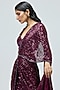 Varun Bahl features a dark purple draped saree in shimmer sequins base adorned with embroidery. It is paired with a blouse. Style it with zircon necklace set, structured clutch and embellished heels for a festive occasion, sangeet, engagement or wedding ceremony.