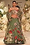 Featuring Varun Bahl's statement floral print in a green lehenga set. The set includes a fully embroidered scalloped blouse along with an organza lehenga highlighted with sequins, cutdana and 3D flowers paired with a printed embroidered dupatta.