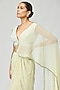 Varun Bahl features a lime green saree in silk chiffon base adorned with pearl and beadwork. It is paired with a blouse and an underskirt. Style it with zircon jewellery and embellished heels for a mehendi, reception, wedding, sangeet or engagement ceremony.