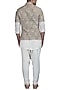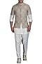 Featuring an ivory kurta in spun silk base. It is paired with matching churidar pants and a raw silk bundi jacket having damask wall print embroidery. Perfect wear for festive occasions or wedding ceremonies.