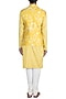 Featuring a mustard bundi jacket in heavy cotton silk base. It is paired with a matching kurta in chanderi silk base with floral print inspired from art nouveau and churidar pants in spun silk base.