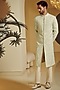 Featuring a sea green sherwani in modal dupion and silk base with resham thread embroidery. It is paired with contrasting churidar pants and a kurta.