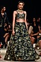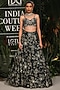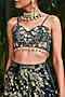 Featuring a midnight blue lehenga in organza base with floral print, including stones, sequins, and pearls highlights. It is paired with a contrasting navy blue corset top having floral embroidery and a printed dupatta.