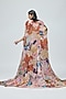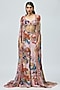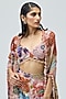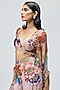 Varun Bahl features a pink cape in viscose georgette base adorned with print and embroidery. It is paired with a bralette and viscose crepe sharara. Style it with dangler earrings and embellished heels for a festive occasion, cocktail, sangeet or engagement ceremony.