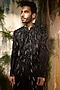 Featuring a black sherwani in japanese polyester base. It is paired with pants. Style it with a stole, mojaris and regal safa, perfect for a wedding or engagement ceremonies rooted in tradition and elegance.