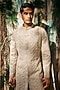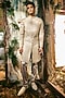 Featuring a gold and silver sherwani in twill silk, satin lycra and organza base with embroidery. It is paired with pants. Style it with a stole, heritage brooch and regal safa, perfect for a wedding, engagement ceremonies or an heirloom look, rooted in tradition and elegance.