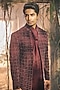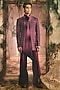Featuring a plum blue open jacket in japanese polyester, twill silk and organza base. It is paired with a kurta and pants. Style it with loafers for a cocktail, reception, engagement or sangeet ceremony.