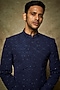 Featuring a sapphire blue bandhgala in poly blend suiting base with aari, glass beads, and stones work. Style it with mojaris for a grand festive celebration, sangeet, wedding or engagement ceremony.