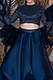 Featuring a midnight blue lehenga in organza and net base with embroidery. It is paired with a matching blouse and a ruffled dupatta.
