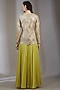 Featuring a beige gold jacket in silk organza base with floral print and gota embroidery. It is paired with matching sharara pants.