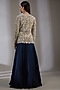 Featuring a grey jacket in chiffon base with floral print and sequins embroidery. It is paired with a contrasting navy blue skirt.