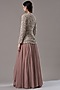 Featuring an onion pink jacket in chiffon base with floral print and sequins embroidery. It is paired with a matching bustier and a chiffon skirt.