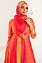 Featuring a pink and orange anarkali in bemberg silk base with print. It is paired with a matching bemberg satin head scarf.